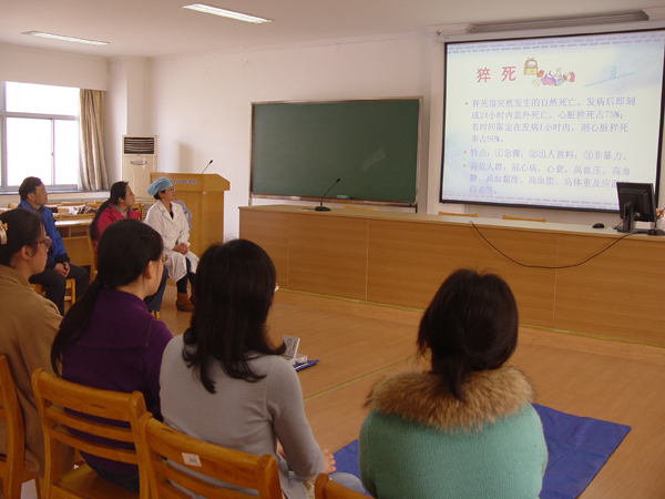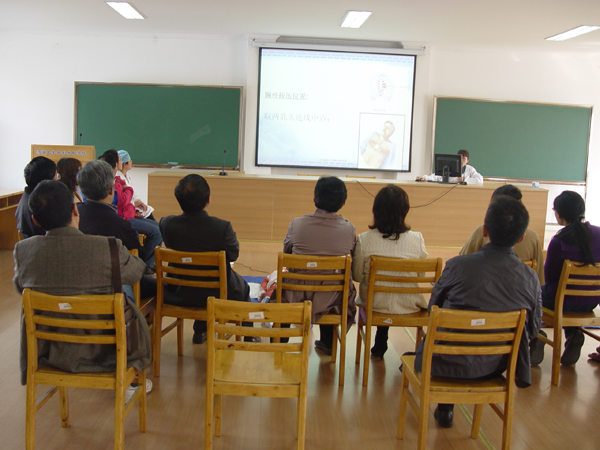 2:30心肺复苏培训课准时开始,学校医院的谷香兰医生用PPT给大家详细讲解了急救的7个步骤,之后又由校医院的医生在珍妮真人(仿真人)上进行模拟示范,现场学习交流非常仔细,每个人都在珍妮真人上进行了模拟操作,包括心脏的挤压、口对口的人工呼吸等。学院宫必宁教授还和大家分享了抢救家中老人的经验。通过这次培训,大家掌握了急救的常识,感到在遇到突发性的事件时,可以沉着应对。