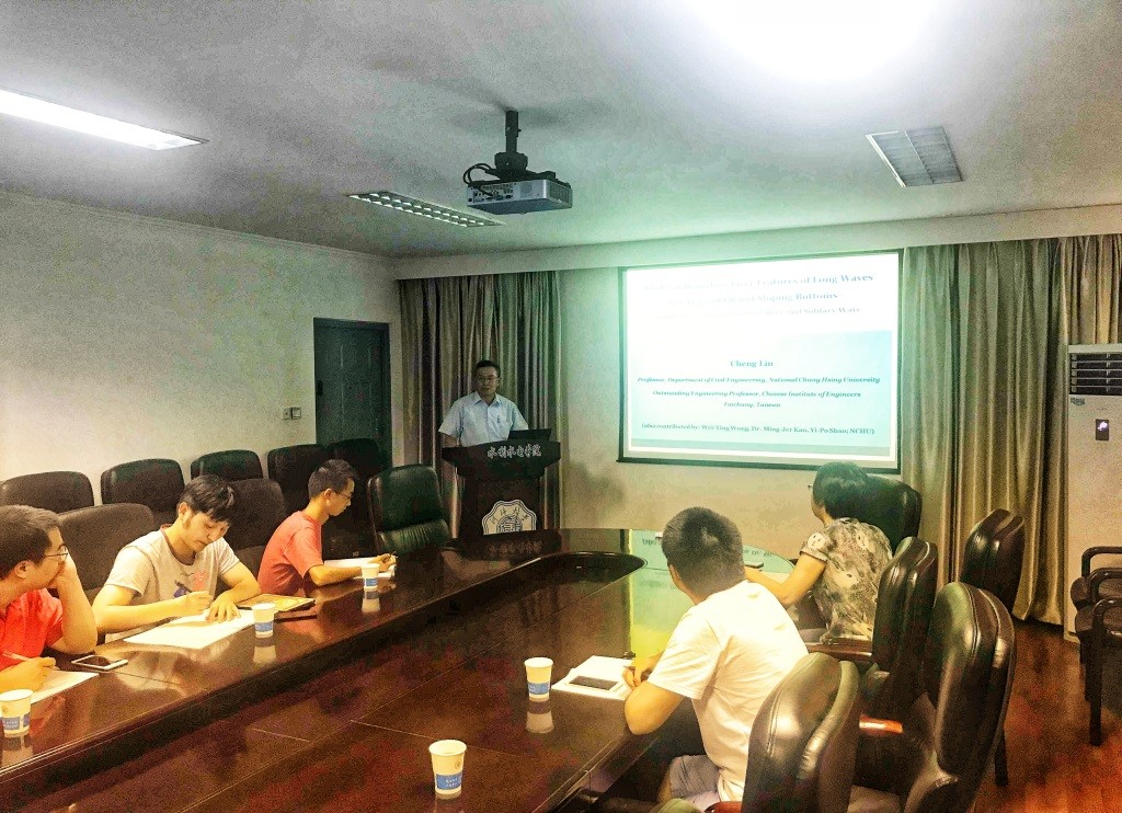 2018年6月27日下午3点,台湾中兴大学林呈教授应邀为成人短视频 师生作了题为“Flow characteristics of undular bores propagating over horizontal and sloping bottoms”的学术报告。林呈教授长期从事海洋动力结构物理模拟实验研究。现担任海洋科学与技术国际期刊(Journal of Marine Science and Technology)编辑、水动力学国际研讨会执行委员、亚洲地区可视化国际研讨会执行委员、美国土木工程学会工程力学研究所紊流工作委员会委员、中国土木水利工程学会理事、中国工程师学会中区分会理事、台湾海洋工程学会理事等职务,有极高的学术造诣。报告由王玲玲老师主持,学校相关专业老师与研究生共四十余人参加了报告会。