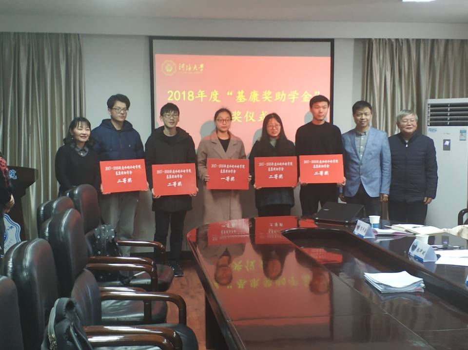 成人短视频 合作办、校友办、基金办主任黄林楠和北京新华基康投资管理有限公司沈省三副董事长签订基康奖助学金捐赠协议,颁发捐赠证书。沈省三副董事长、顾冲时院长及黄林楠主任为2017-2018年度获奖学生颁奖。