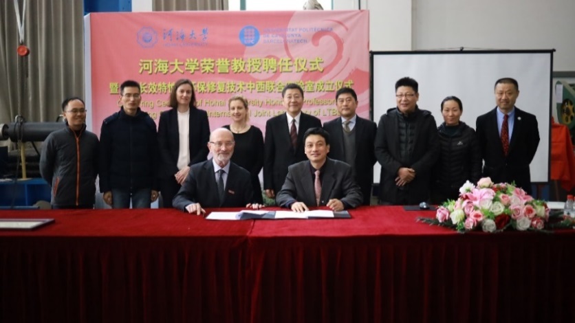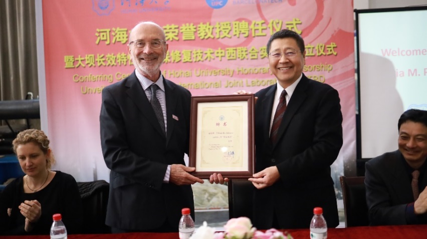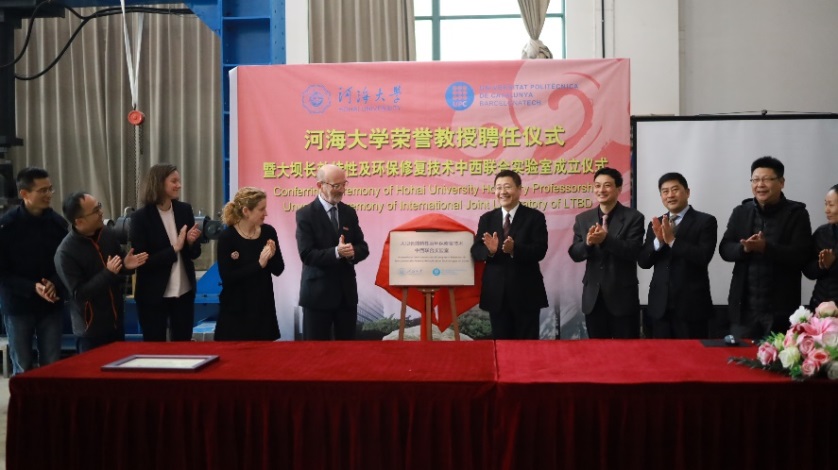 12 月 13- 14 日,由学院承办的大坝长效特性及环保修复技术中西联合实验室成立仪式在水电学院水工结构研究所试验大厅顺利举行。副校长徐卫亚、国际合作处副处长陈红胜、科技处副处长王建、人事处副处长刘宇琳、水电院副院长沈振中等出席了成立仪式。水工结构研究所所长刘斯宏教授主持了成立仪式。徐卫亚副校长代表学校向联合实验室首席科学家 Eduardo Alonso 教授颁发荣誉教授聘书,欢迎 Eduardo Alonso 教授加入成人短视频 ,希望其为学校教学、科研以及国际化人才培养作出积极贡献。刘斯宏教授介绍了 Eduardo Alonso 教授简历和学术成就。
