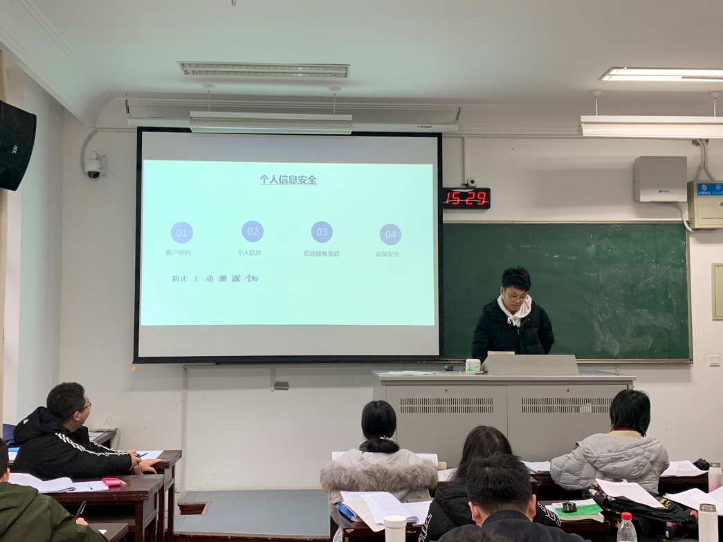 1月3日,2016级水工四班举行“安全大于天”主题班会。班会结合学校安全教育的需求,就网络诈骗、盗窃偷窃、网络言论、违章电器、禁止黄赌毒等内容进行了宣传教育,上紧了同学们心中的“弦”,明确了不可触碰的底线。