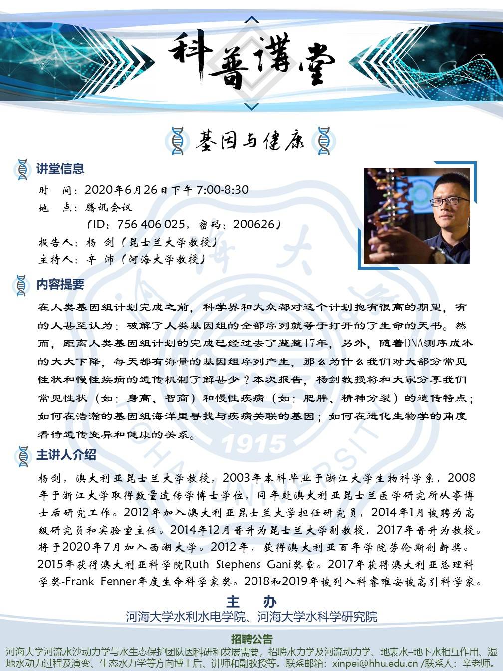 在人类基因组计划完成之前,科学界和大众都对这个计划的有很高的期望,有的人甚至认为:破解了人类基因组的全部序列就等于打开的了生命的天书。然而,距离人类基因组计划的完成已经过去了整整17年,另外,随着DNA测序成本的大大下降,每天都有海量的基因组序列产生,那么为什么我们对大部分常见性状和慢性疾病的遗传机制了解甚少?本次报告,杨剑教授将和大家分享我们常见性状(比:身高、智商)和慢性疾病(如:肥胖、精神分裂)的遗传特点;如何在浩瀚的基因组海洋里寻找与疾病关联的基因;如何在进化生物学的角度看待遗传变异和健康的关系。