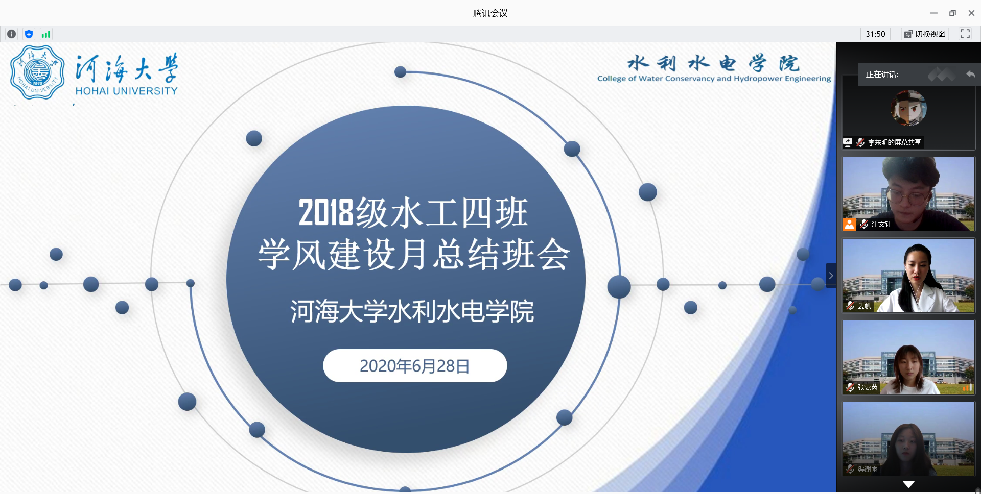 根据学校开展领导干部结对联系学生工作的相关要求和学院整体安排,6月28日下午,水电院2018级水工四班举办“隔空不隔爱,停课不停学”学风建设线上主题班会。成人短视频 副校长郑金海、水电院党委副书记王方、2018级水工四班全体同学参加班会。2018级本科生辅导员姜帆主持班会。