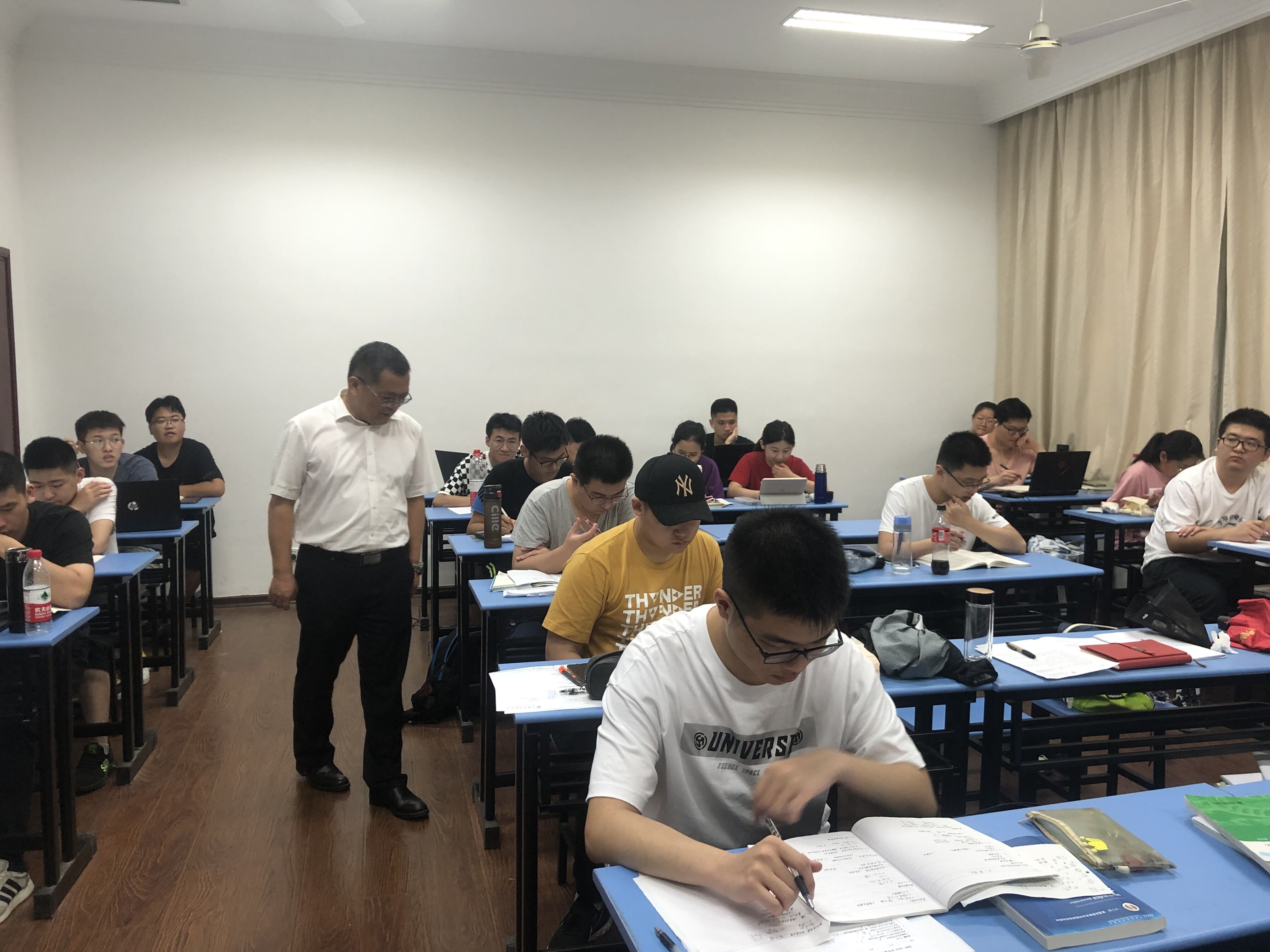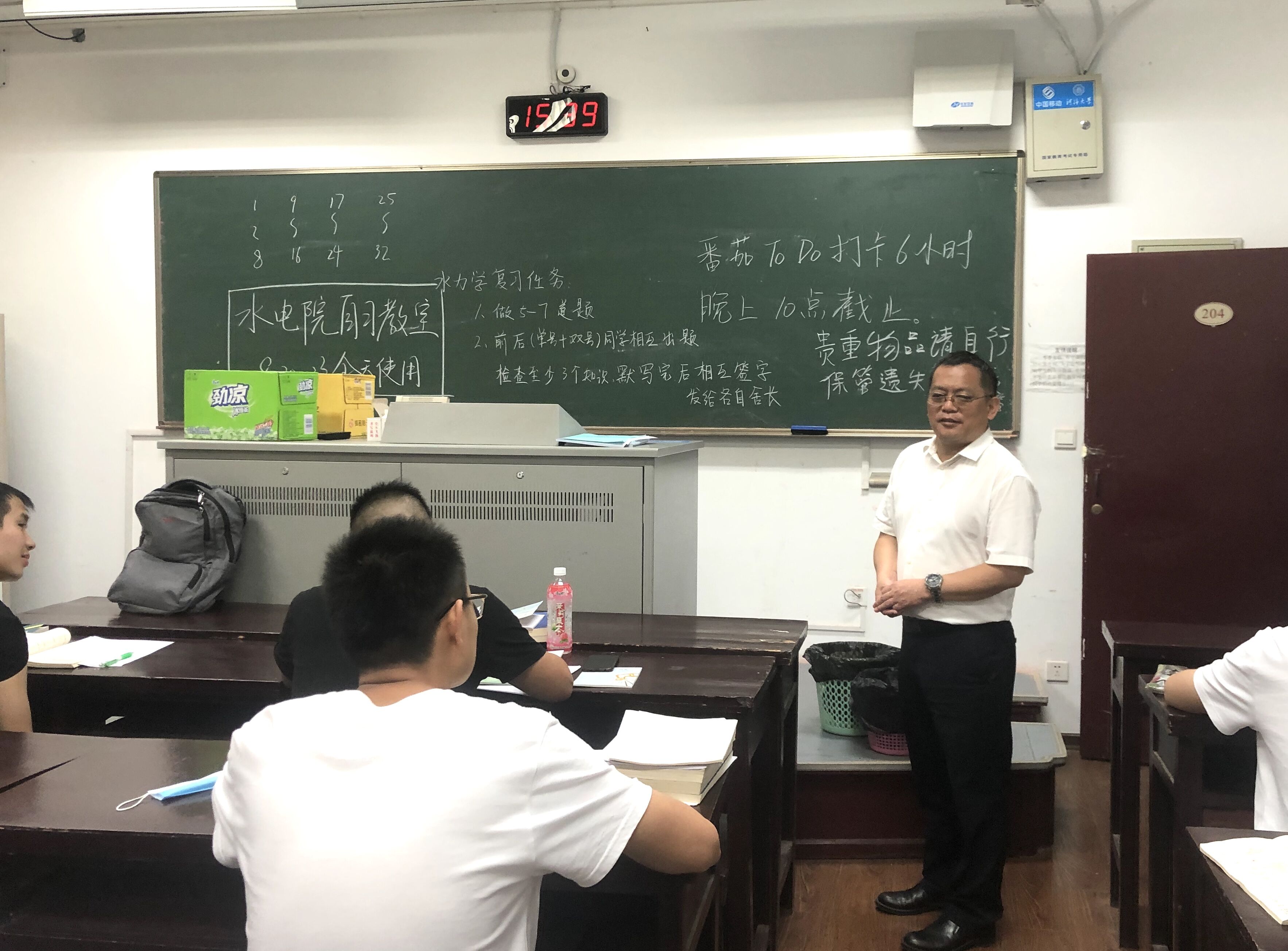 任旭华书记来到同学们正在上自习的教室,代表学院向同学们表达了关心和问候,并为同学们带了清凉饮料。他了解了同学们返校及搬迁的情况,希望同学们积极配合学校关于防疫工作的部署和安排,如有困难要在第一时间联系辅导员老师、校医院及相关部门取得帮助。他强调,在实行严格的校园防控管理过程中,返校学生要健康作息、遵纪守规,做到放心在校、安心学习、舒心生活,以实际行动打好返校复学疫情防控阻击战,展现新时代水电学子的担当与作为。此外,他还鼓励同学们要以昂扬向上的精神面貌和艰苦朴素的生活作风认真复习,积极应考,争取取得优异的成绩。