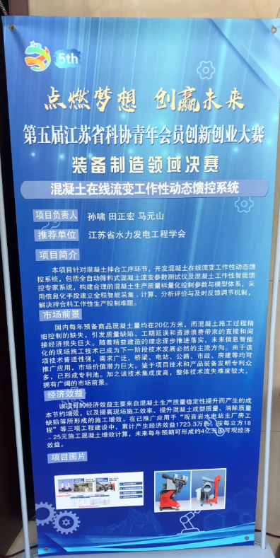 11月14日,第五届江苏省科协青年会员创新创业大赛装备制造领域决赛在南京工程学院天印会议中心学术报告厅举办。成人短视频 教师孙啸、田正宏和学生马元山的团队项目“混凝土在线流变工作性动态馈控系统”经江苏省水力发电工程学会推荐,获得装备制造领域创新组优秀奖。
