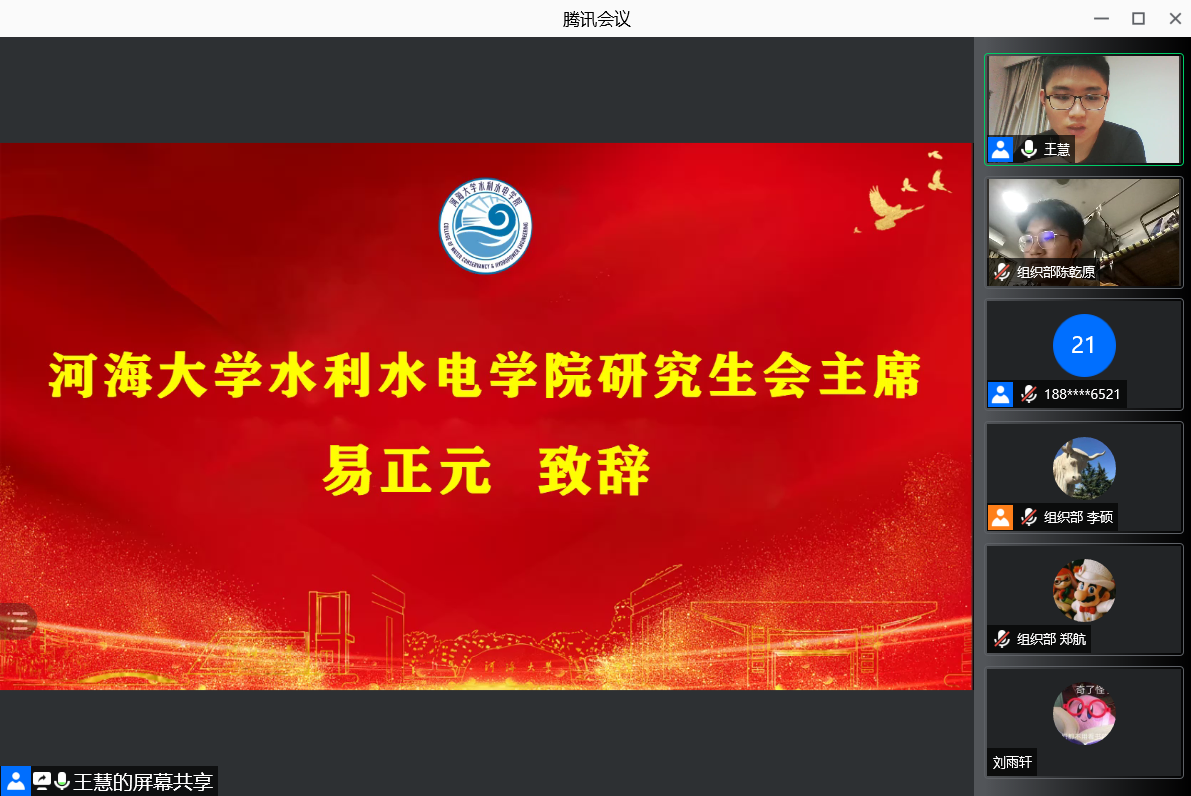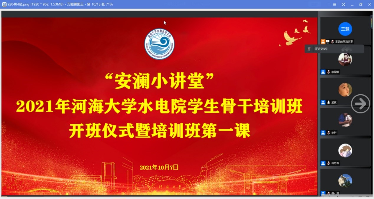 10月7日,“安澜小讲堂”——2021年成人短视频 水电院学生骨干培训班开班仪式暨培训班第一课在线上召开。成人短视频 研究生会主席团成员金子又、成人短视频 水电院研究生会主席易正元、副主席高阳、冯思奇及部长团成员出席本次培训,水电院第十九届研究生会全体成员及第二十四届学生会部分成员参与本次活动,活动由秘书处王慧主持。