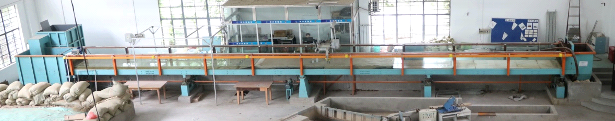 泥沙实验室(水环境综合治理实验厅)始建于1986年,面积达1600m2,实验厅有大型水沙变坡循环水槽2条、非恒定水沙交汇循环水槽1条、环形水槽1条;设有综合控制室、水力学实验室、泥沙颗粒分析室;浑水系统泵房装机4台、清水系统泵房装机3台等设备。有两个野外实验基地:洪泽湖、长江-鄱阳湖交汇口物质输移及生态效应试验区。实验厅以平原地区水灾害、水资源、水环境与水生态等问题为研究对象,聚焦于理论分析、模型试验、数值计算和野外监测,围绕以下几个方面开展研究: