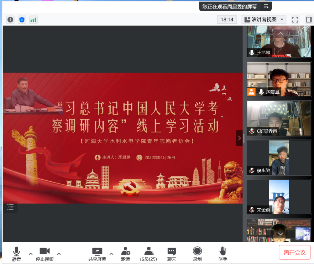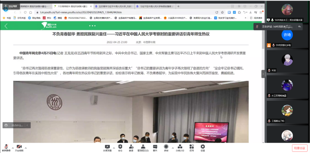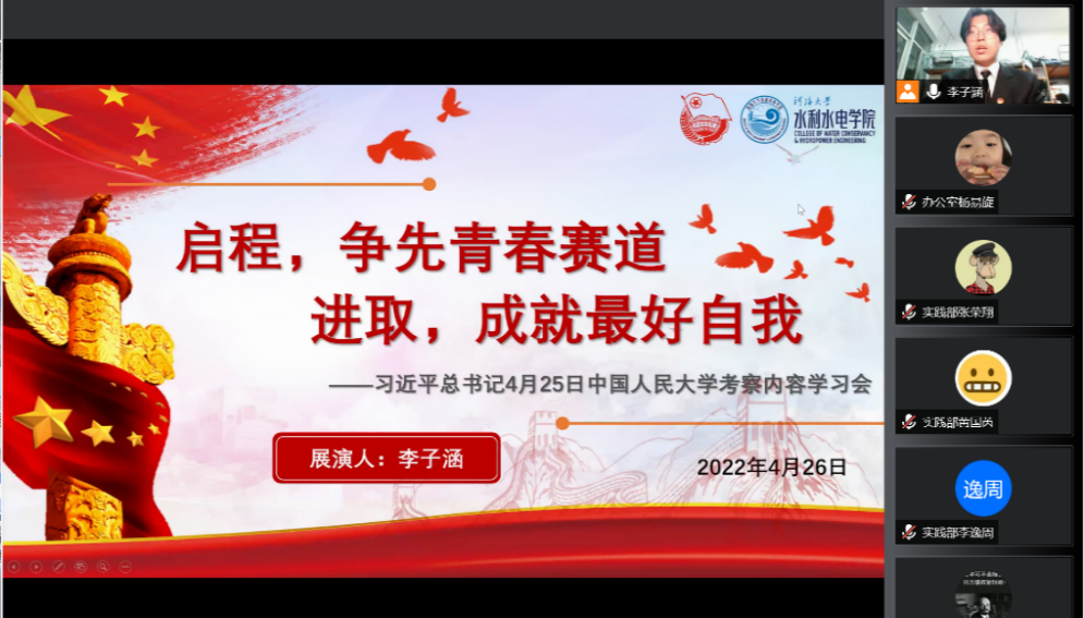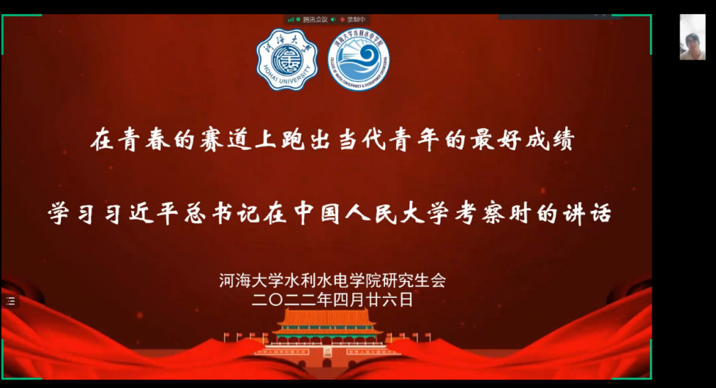 院研究生会于4月26日晚以腾讯会议的形式举行了专题学习交流会。通过播放习近平总书记在中国人民大学考察时的新闻视频,结合成人短视频 水利工程的一流学科特色进行了进一步的分享和交流。从新民主主义革命时期的张闻天精神,到新中国建立后的兴修水利,一代又一代的河海青年都在自己的岗位上发光发热。