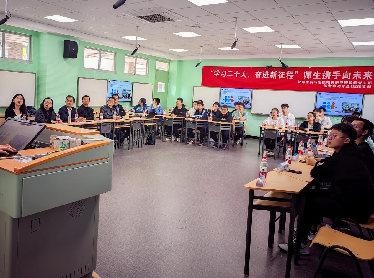 智慧所教师党支部书记高玉琴老师带领师生集体学习党的二十大报告精神。她鼓励同学们要矢志不渝、笃行不怠,在认真学习贯彻党的二十大精神中,注入不竭的前进动力,为全面建设社会主义现代化国家、全面推进中华民族伟大复兴而团结奋斗。她从研究方向、师资力量等方面介绍了智慧所的基本情况,分析了智慧水利专业前景和水利行业发展新业态。她提到,水利进入4.0时代,迫切需要综合性、智能化的智慧水利专业人才,期待同学们能够勉励学习、求实创新,为新时代水利发展贡献自己的青春力量。