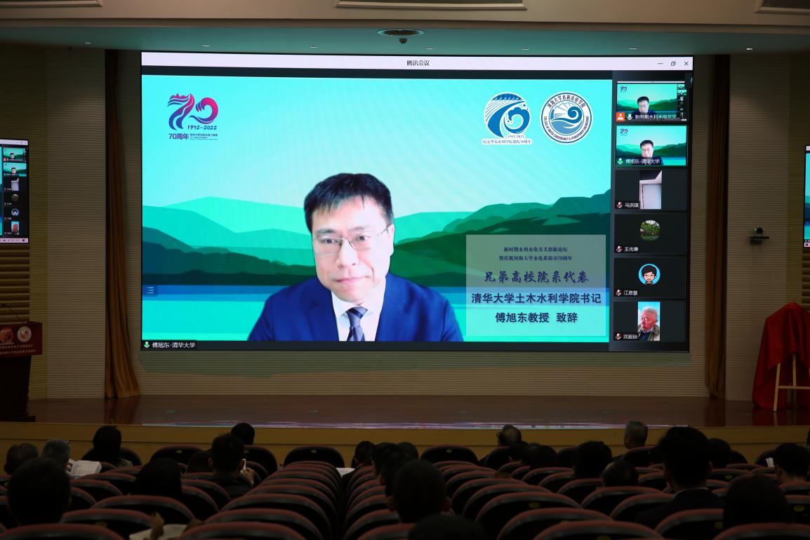 唐洪武代表学校向线上线下的各位嘉宾表示热烈欢迎。他指出,水电系从建系初期艰苦创业,到河川系时期开拓奋进,从改革开放以来提高发展,再到进入新时代以后创新引领,水电系作为一个团结奋斗的集体,完成了从初创到逐渐成长壮大的蜕变在多个领域取得全球一流科研成果,实现国际“并跑”,甚至“领跑”。七十年来,学院始终站在学校办学的第一梯队,始终是学校发展的一张王牌,为推动学校“双一流”建设和服务国家水利事业发展作出了重要贡献他希望,学院要以建系七十年为新的起点,在更广阔的历史舞台上发出水电声音,作出水电表率,成就水电事业一要担当使命,坚持为党育人、为国育才,始终将家国情怀牢记心间,以深沉热爱矢志奋斗培养能够担当民族复兴大任的时代新人二要持之以恒加强新时代教师队伍建设,引导教师成为学生为学、为事、为人的“大先生”注重教学科研育人并重,做到出人才、出成果、出经验、出示范。三要集聚力量引领水利工程学科创新发展始终锚定“四个面向”,塑造创新创造新动能,挖掘水利学科发展新优势努力将学院建设成为世界顶尖的水利人才培养标杆和科技创新旗帜