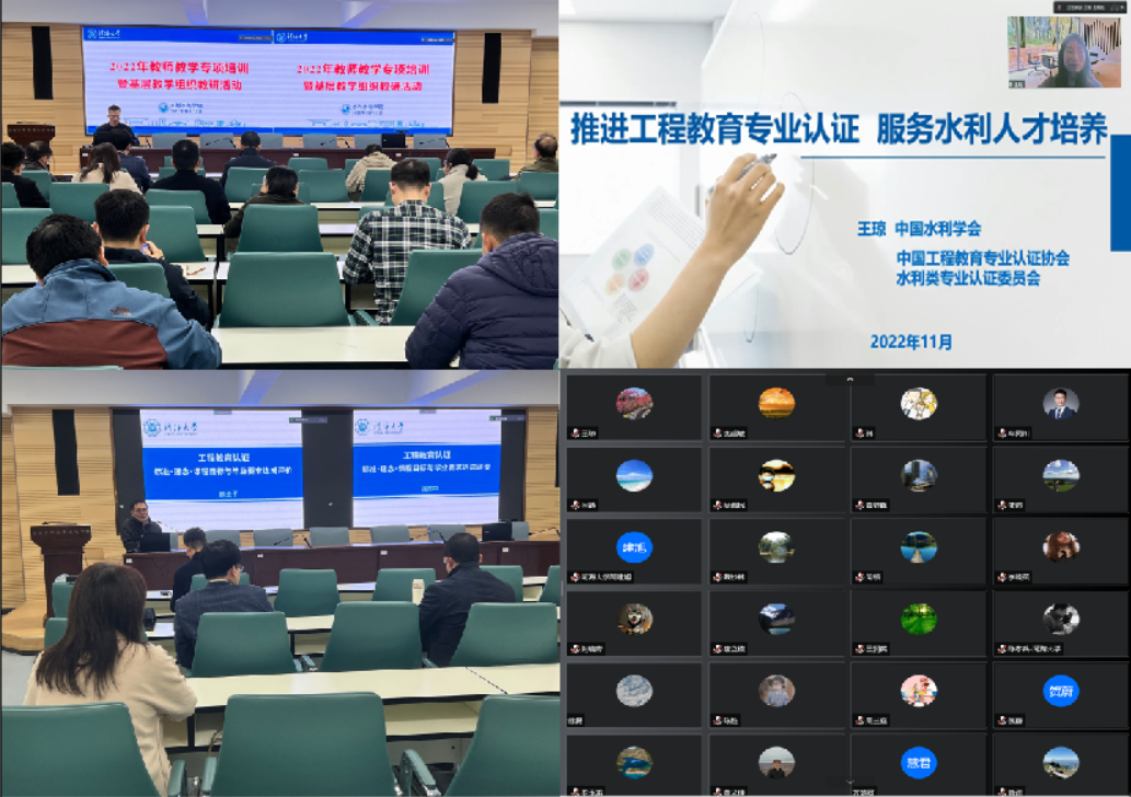 11月23日,成人短视频 组织开展了教师教学专项培训暨基层教学组织教研活动,中国工程教育专业认证协会水利类专业认证委员会王琼副秘书长,中国工程教育认证专家、成人短视频 顾圣平教授受邀作专题报告。成人短视频 水利水电工程系办、智慧水利系办、专业办、部分课程负责人、青年教师代表、教学秘书等参加了研讨会,会议由王建副院长主持。