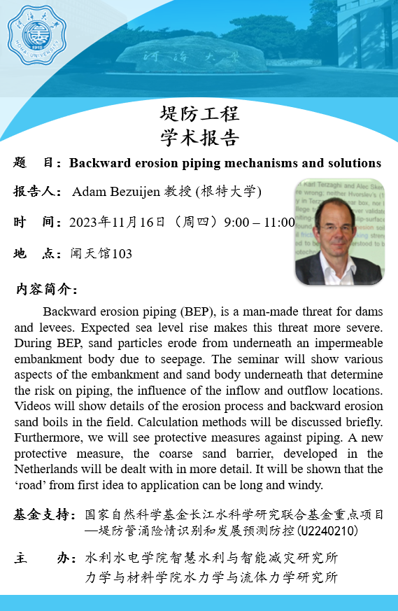 学术报告会 | 堤防工程后向侵蚀型管涌机理及防治措施