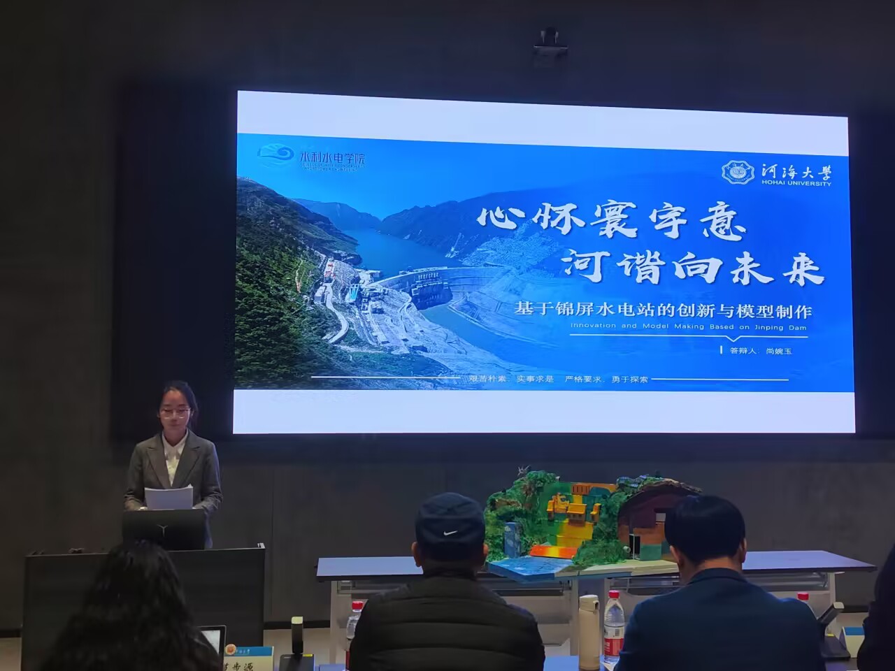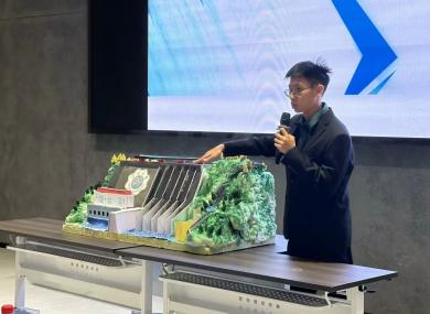在比赛现场,选手结合PPT、三维建模及动画演示,展示所做大坝模型,说明作品制作理念、创新亮点等基本信息。评委老师在充分了解各组坝型的特点后,感叹同学们的设计巧妙、想法独特,也从坝体结构、专业布置、创新设计等多方面提出宝贵意见和进一步改进的建议。