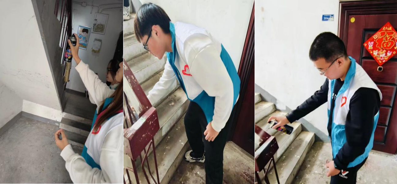 同学们手持油漆喷罐,在楼道里忙活着为居民清理各种小广告,把脏乱的楼道变得干净整洁。