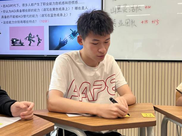 第二环节,“你认为AGI具备哪些能力”和“哪些是人具备的不能被AGI取代的能力”的讨论交流,同学们踊跃参加,归纳出AGI具备数据分析与处理、搜集信息和处理信息等能力,但不能取代人的创新性、道德伦理、情感交流等能力。姜帆老师由此提出“AI+人的组合是未来职业世界的趋势,能够提升未来跨界发展能力”的观点,点明AGI时代对职业产生影响的原因。