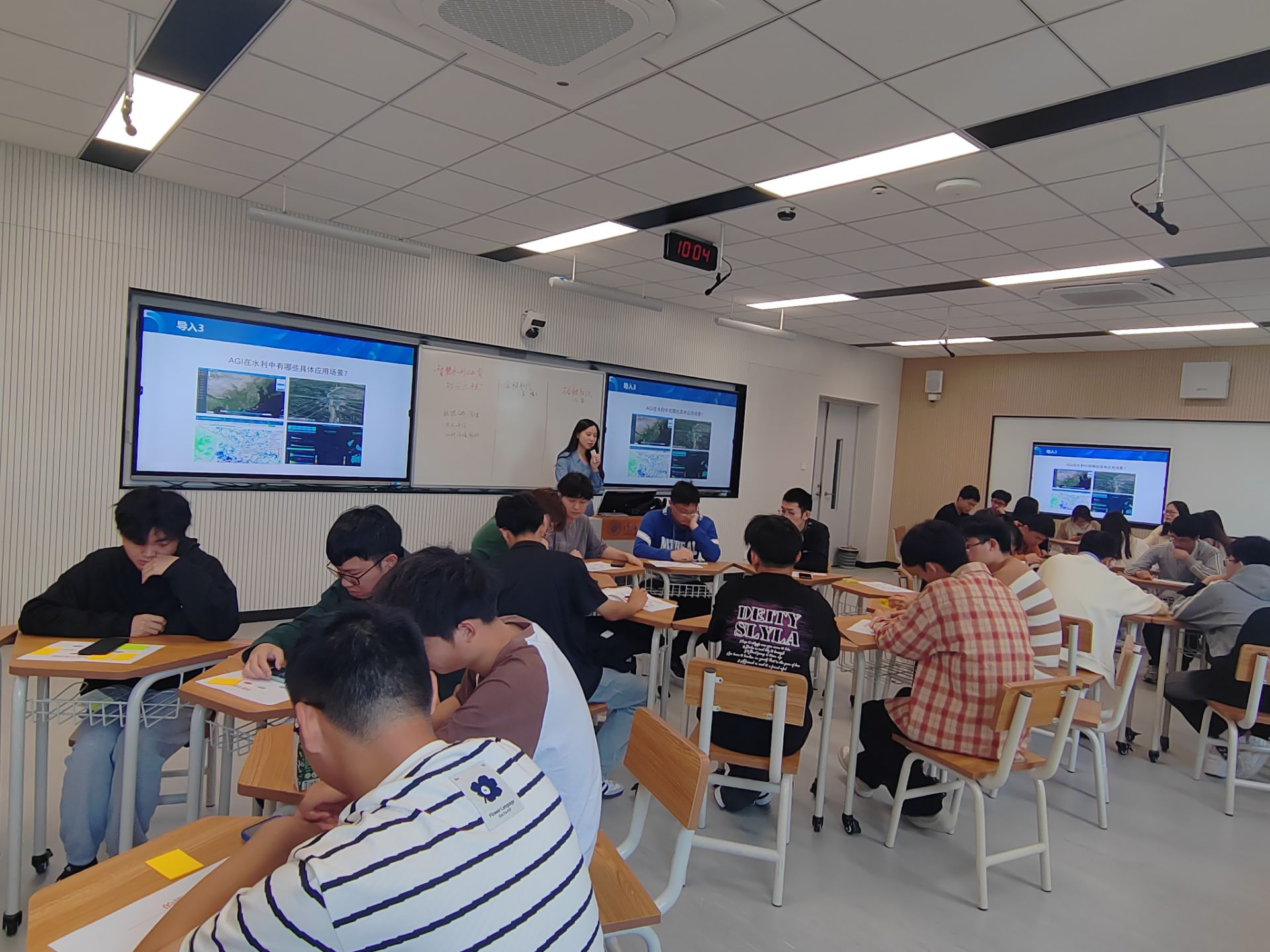 第一环节,通过“你如何看待CHATGPT和SORA?”和“AGI在水利中有哪些具体应用场景?”话题导入,各小组同学充分交流、积极发言,认为CHATGPT和SORA的使用利大于弊,有利于开发创新思维,但多数是企业在使用,并未推广到广泛群体”等观点,认为AGI可以应用在数据分析、洪水管理、水利环境预测等方面。