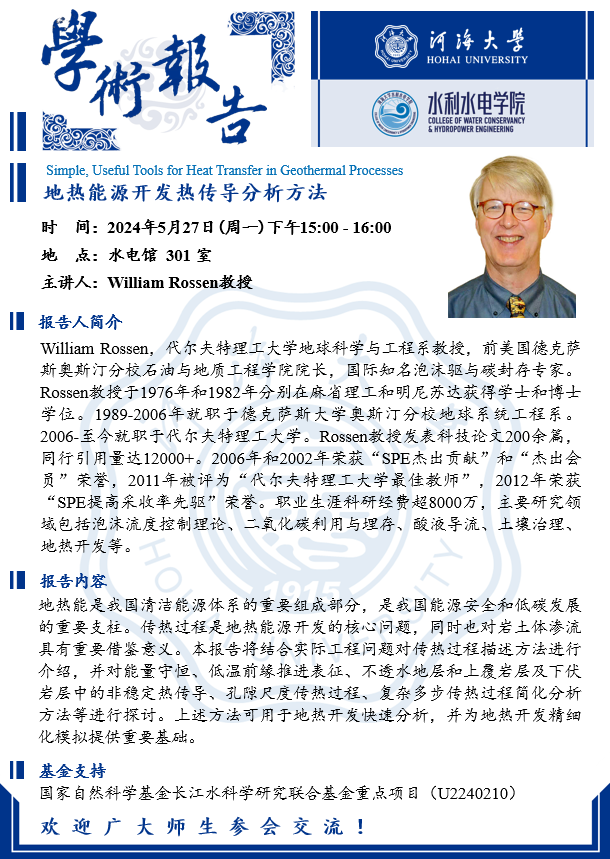 学术报告| 地热能源开发热传导分析方法(William Rossen教授,荷兰代尔夫特理工大学)