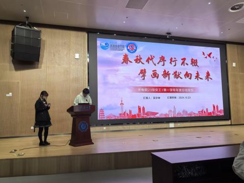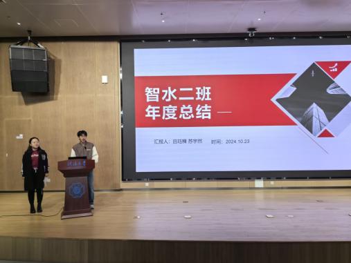 2023级智水二班班长苏宇然、团支书吕珏稞围绕“智水二班年度回忆”主题进行汇告。五育并举,百花放;砥砺前行,创辉煌。智水二班始终关注每位同学的需求,积极组织活动,让每个人都感受到归属感和团队的温暖。