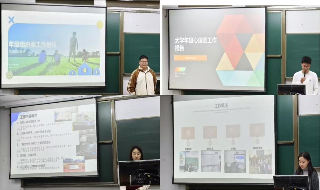 会议开始由2024级本科生年级委、各班班长、团支书进行述职报告,一是分享了开学至今的工作内容与收获,二是总结和反思了工作中的经验和不足,三是表达了对未来工作的展望与期待。每位同学都为此次报告会做了充分的准备,通过ppt展示、工作经验分享、下一阶段工作规划等形式与在座老师、同学汇报交流,全体成员认真倾听、记录心得感悟、开展讨论交流。
