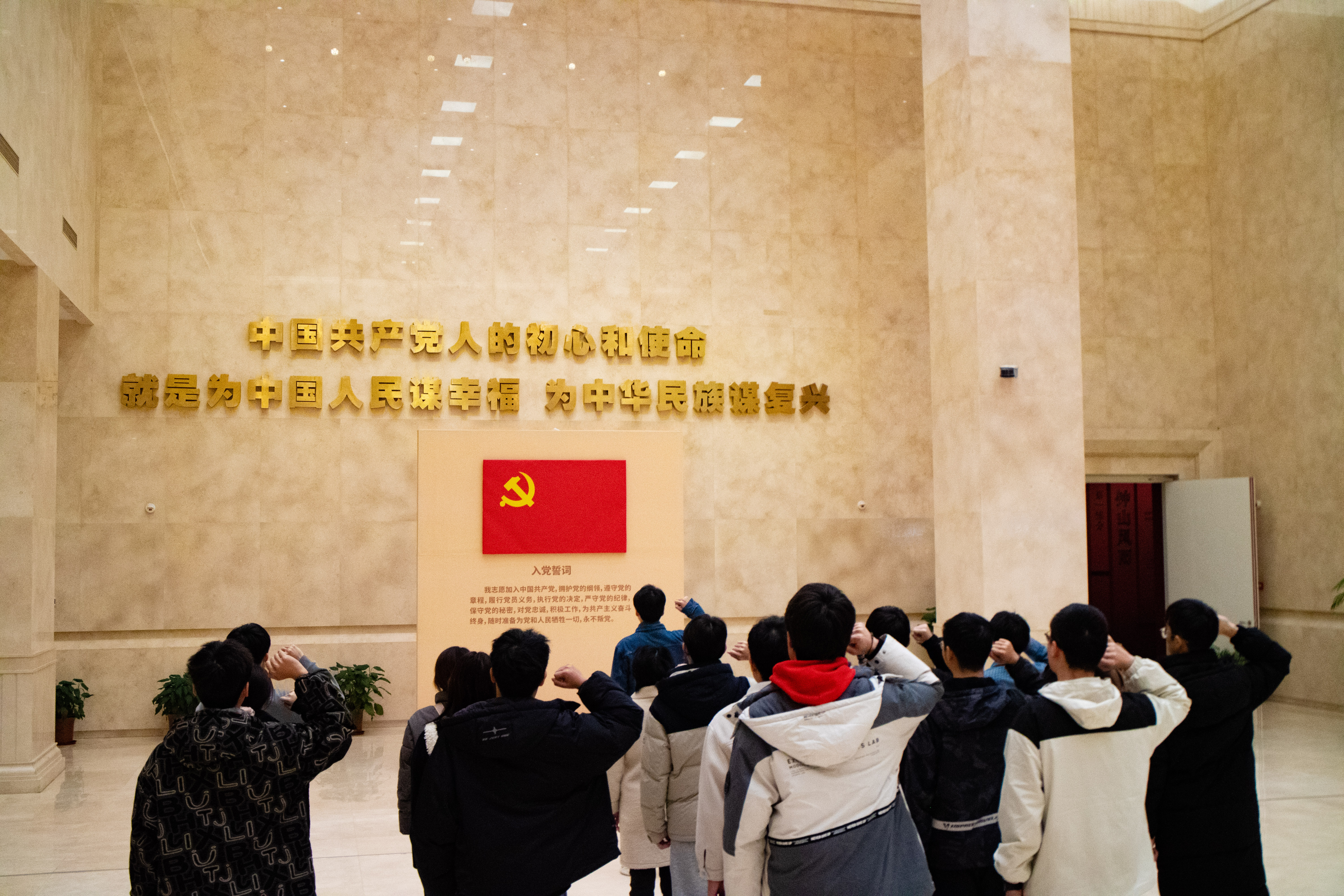 在“人间正道是沧桑——中国共产党南京历史展”的金色大厅,2023级水工结构硕士生第一党支部与2022级水利水电工程专业2班的中共党员重温入党誓词,牢记中国共产党人的初心和使命,就是为中国人民谋幸福,为中华民族谋复兴。