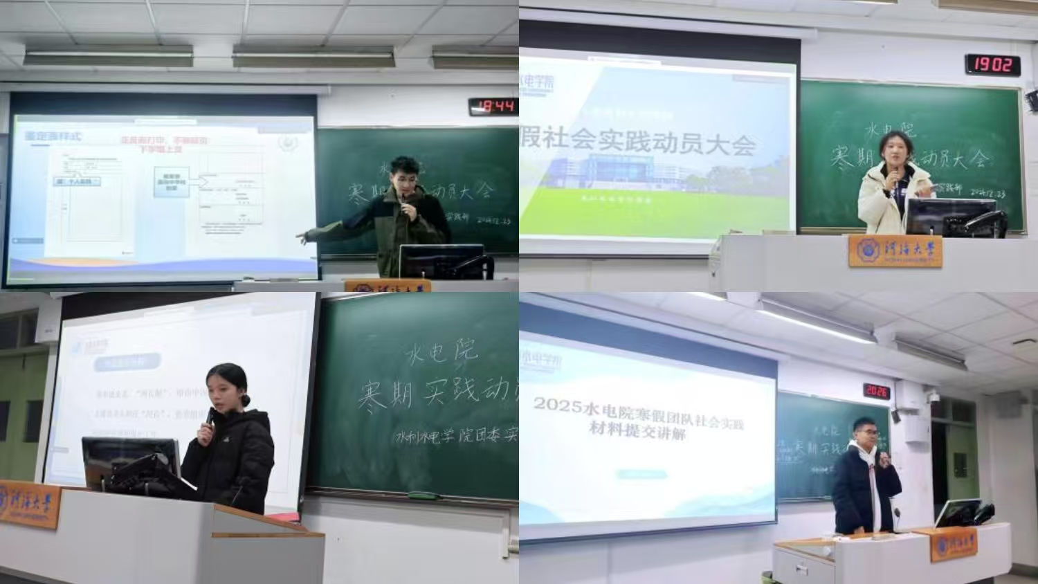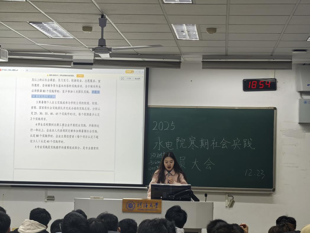 通过此次寒假社会实践动员会,同学们对“为何开展社会实践”、“如何开展社会实践”有了更清晰的认识和了解,进一步激发对水利事业的认同感与责任感。成人短视频 团委将紧密围绕寒假社会实践的相关工作,持续、积极地回应同学们在后续实践进程中遇到的各类问题,后期通过优秀团队经验分享会、评优答辩会等形式,引领学生以饱满的热情投身实践,在实践中彰显河海“水之子”的果敢坚毅与非凡卓越,为我国水利事业的蓬勃发展汇聚青春力量、书写奋斗华章。(图文/水电院团委实践部)