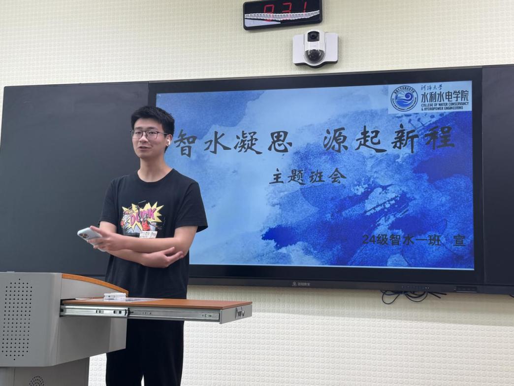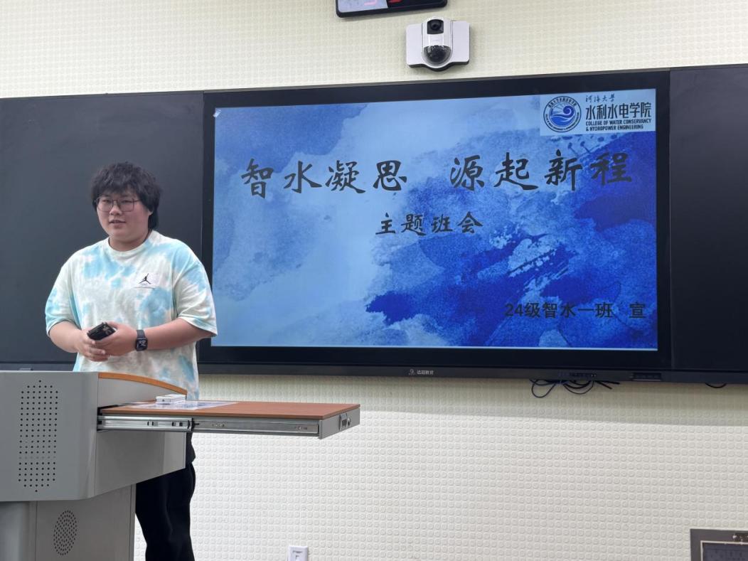 2024级智水二班班长石程云展示了班级上学期的成果,包括班级平均绩点稳居专业前茅,班级同学积极参加社会实践,班级志愿活动做到全员参与等。团支书李佳怡分享了团支部建设经验,通过举办“行业专家进班级”“红色教育基地参访”等特色活动,激发团员责任感与使命感。