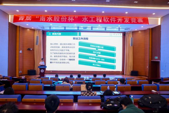开幕式后,“南水股份杯”水工程软件开发竞赛正式开始。首届水工程软件开发大赛聚焦于工程软件二次开发、水力学计算、水库多目标优化调度、河网地区闸泵联合调度、水环境模拟等前沿方向,共有9组本科生队伍、13组研究生队伍进入决赛进行成果展示与项目答辩,分设2个会场同时答辩评审。