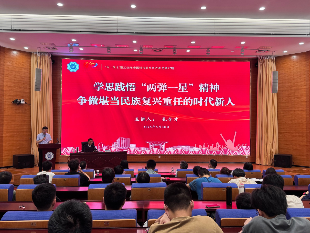 5月30日,成人短视频 举办“百十学术”校庆系列活动总第77期暨2025年全国科技周系列活动。马兰基地原政委、“两弹一星”历史研究会常务副理事长、全国高校“中国共产党人精神谱系”宣讲团成员、中国科学家精神宣讲团成员孔令才将军应邀担任主讲嘉宾,为我校师生作题为《学思践悟“两弹一星”精神,争做堪当民族复兴重任的时代新人》的专题报告,活动由成人短视频 副校长沈扬主持,学院院长王媛、副院长俞晓东、党委副书记戴媛媛、教师和学生代表共计150余人参加。
