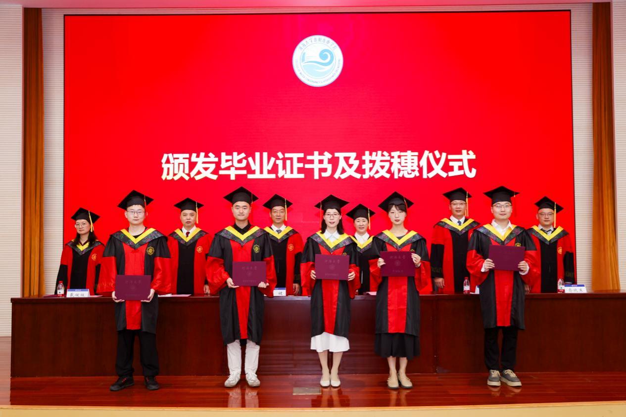 学院领导为全体毕业生颁发毕业证书,扶正流苏,合影留念。