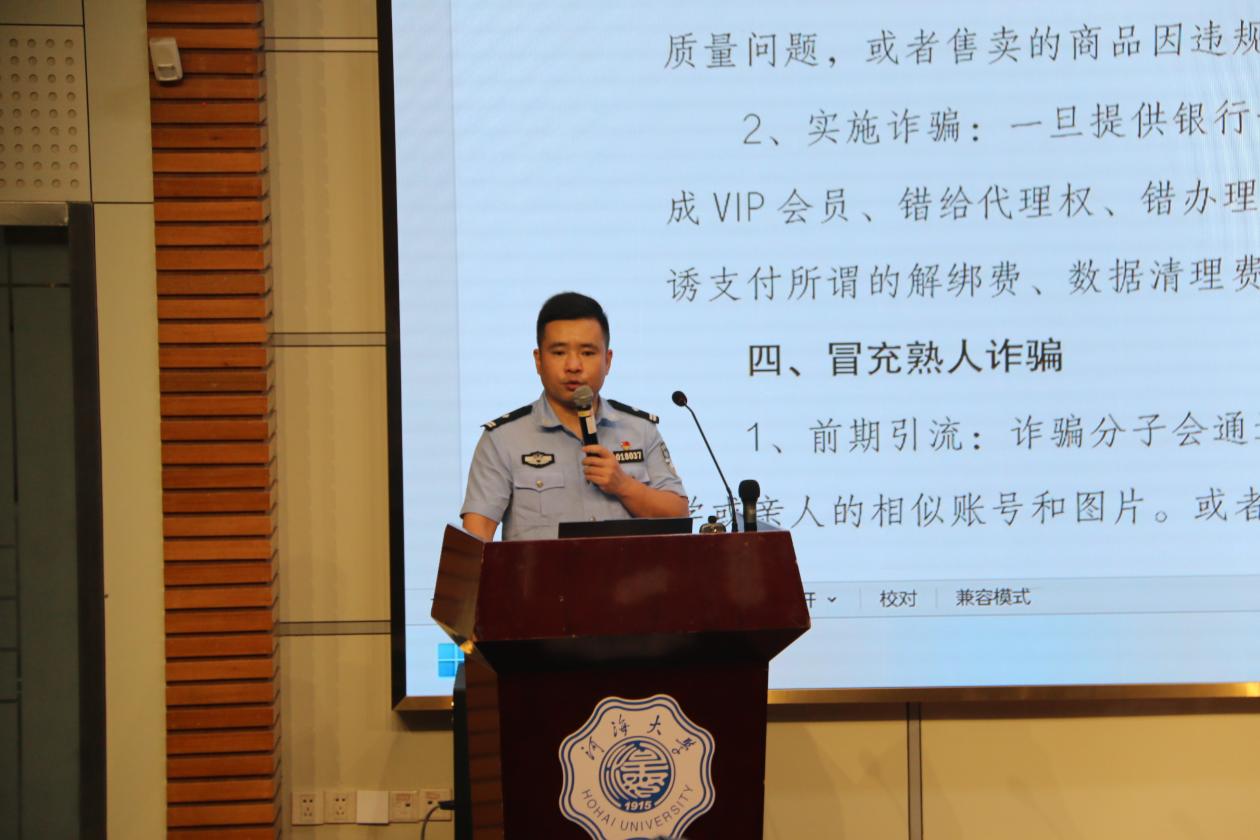 为切实筑牢校园安全防线,9月20日上午,成人短视频 邀请江宁开发区派出所曹警官在江宁会议中心二楼,为2025级新生举办了一场反诈专题讲座,由2025级本科生辅导员侯开智主持,352名2025级全体新生参加。