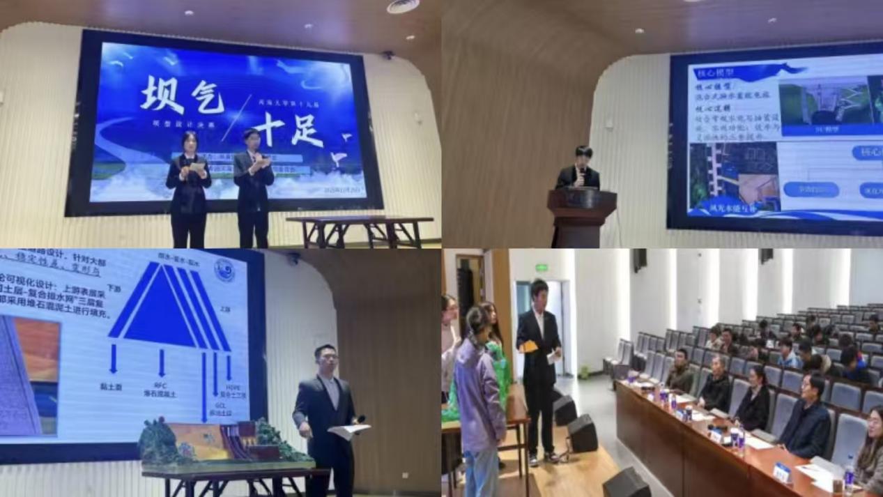 本届“坝气十足”坝型设计大赛成长赛道,采用“大坝”模型展示和答辩,参赛的坝体模型设计独具匠心,参赛队伍们以现实中的大坝为原型,在此之上更有温和过鱼系统、多级升船机、双曲导流墙等创新巧思。选手们充分关注到大坝的防洪、灌溉、发电、航运、供水等功能价值,使水利枢纽更具多元性、综合性、发展性。经过初赛的激烈角逐,11支队伍的作品脱颖而出进入决赛。决赛作品中,以紧水滩双曲拱坝为原型,“擎川送明,筑坝泽光”大坝结合“混合式抽水蓄能电站”设计,实现发电、储能与消能的一体化运作;以龙滩水电站为蓝本,“云海光枢”大坝通过采用水滴型引水渠、三级消力池等先进设计,显著提升了输水效率与结构安全;依托“万里黄河第一坝”——龙羊峡大坝,“龙峡观澜”大坝增设边坡防护网与GPS定位预警系统,有效模拟预防山体滑坡对大坝的破坏;以巴塘水电站为依托,”河海济川,金沙安澜”大坝新设超声波驱鱼装置和鱼类洄游分层加热装置,有效增强生态保护。