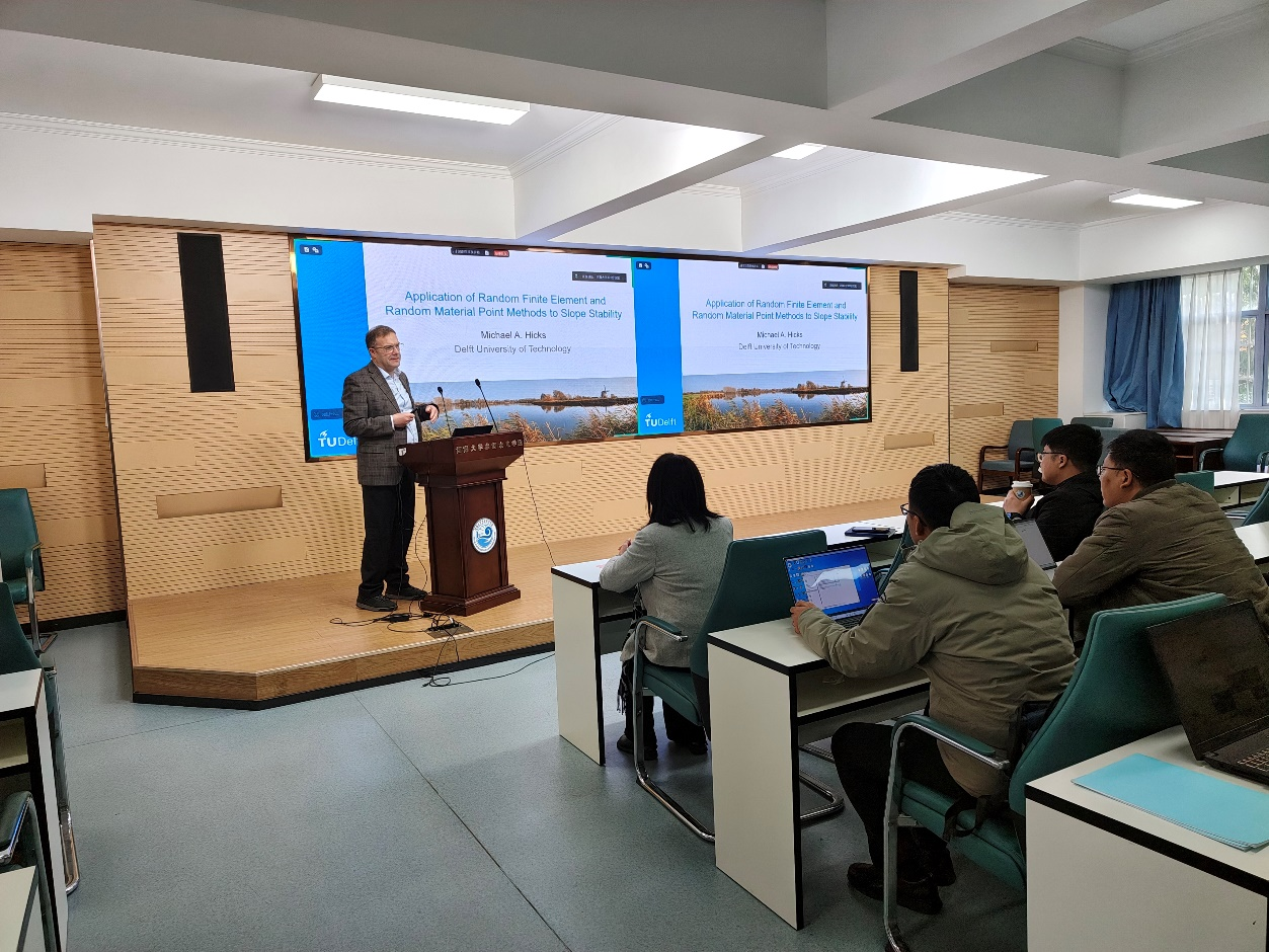 2025年12月8日上午,应王媛教授邀请,国际岩土工程领域权威专家、荷兰代尔夫特理工大学Michael Hicks教授访问我校,并作题为“Application of the random finite element and random material point methods to slope stability assessments”的学术报告。