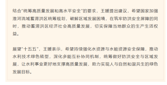 新华日报、中国水利微信公众号刊登王媛委员主题为“聚焦水安全,推动淮河流域蓄滞洪区发展”的建议——结合“统筹高质量发展和高水平安全”的要求,王媛提出建议,希望国家加强淮河流域蓄滞洪区统筹规划,破解区域发展困境,在筑牢防洪安全屏障的同时,推动蓄滞洪区经济社会高质量发展,切实保障当地群众的生产生活权益。展望“十五五”,王媛表示,希望持续强化水资源与水能资源安全保障,推动水利技术绿色转型,深化多能互补协同机制,统筹做好防洪安全与区域发展,让水利事业更好地支撑高质量发展,助力实现人与自然和谐共生的绿色发展目标。